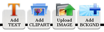 Once you are in the designer you will be able to add text, add clip art from our clip art library, change the background image and upload images. In order to select these options, click on the buttons at the top of the designer.