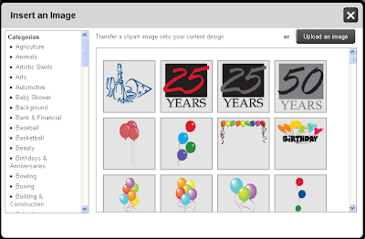 We have birthday clip art you can use. Click on the "Add CLIPART" button. This will open up a popup window of all of our clipart. Scroll down until you see the "Birthdays & Anniversaries" category and click on it to load the images. Click on an image to load it into the designer. You can then re-size and rotate the image.