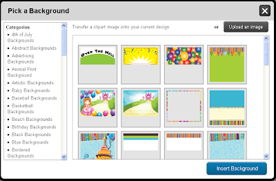 We have birthday backgrounds available. Click on the "Add BCKGND" button. This will open a popup window of all of our backgrounds. Scroll down until you see the "Birthday Backgrounds" category and click on it to load the images. Click on a background you would like and click the "Insert Background" button to load it into the online designer.